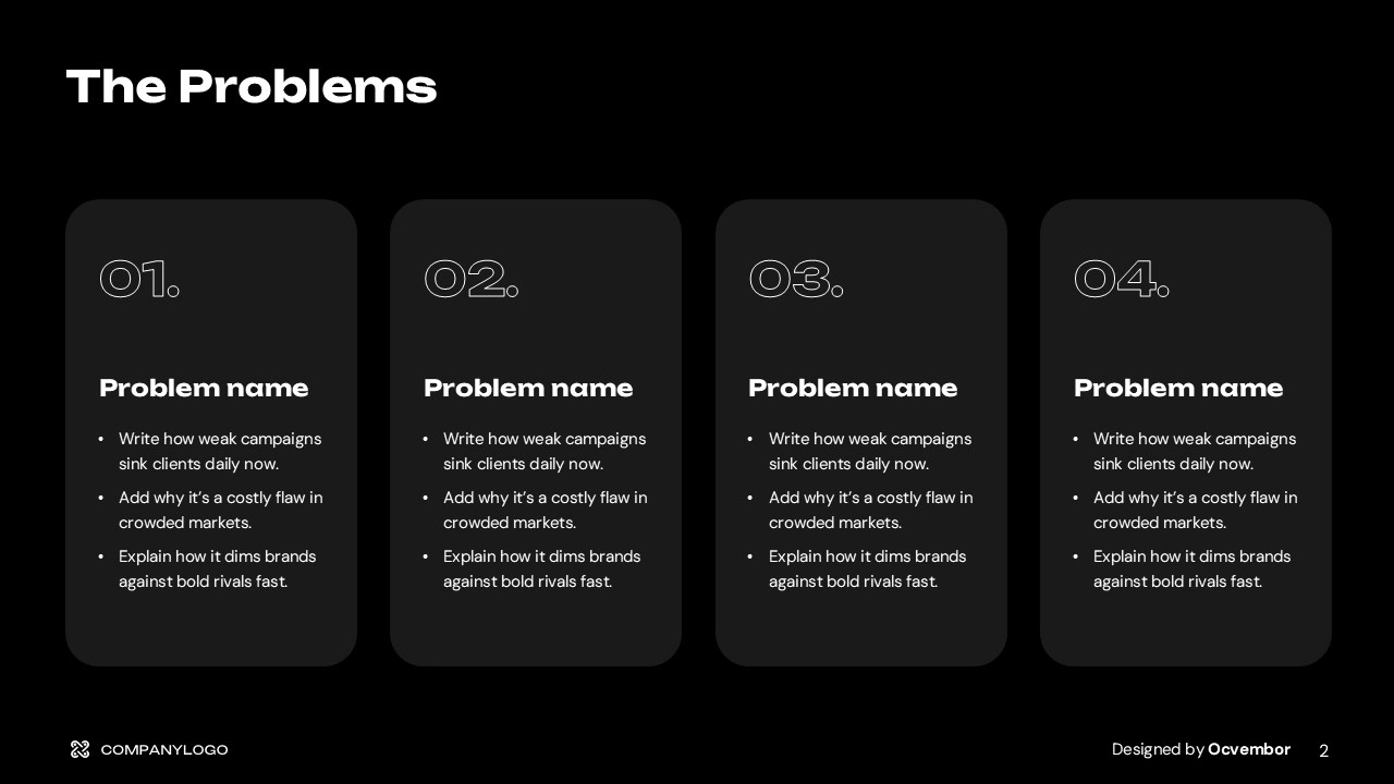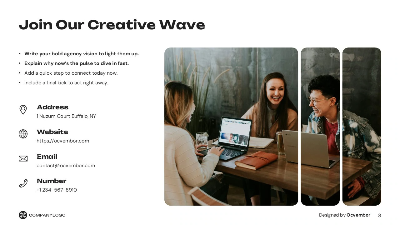 Across 8 slides, you’ll tackle market challenges, innovative solutions, opportunities, and proven traction. Start by highlighting creative hurdles that stifle brands, then showcase services like bold campaigns or strategic design that ignite impact. Market slides reveal demand, business models outline revenue streams, and traction charts prove growth. Your team’s talent builds trust, and a final call to join the wave sparks action, positioning your agency as a creative leader.