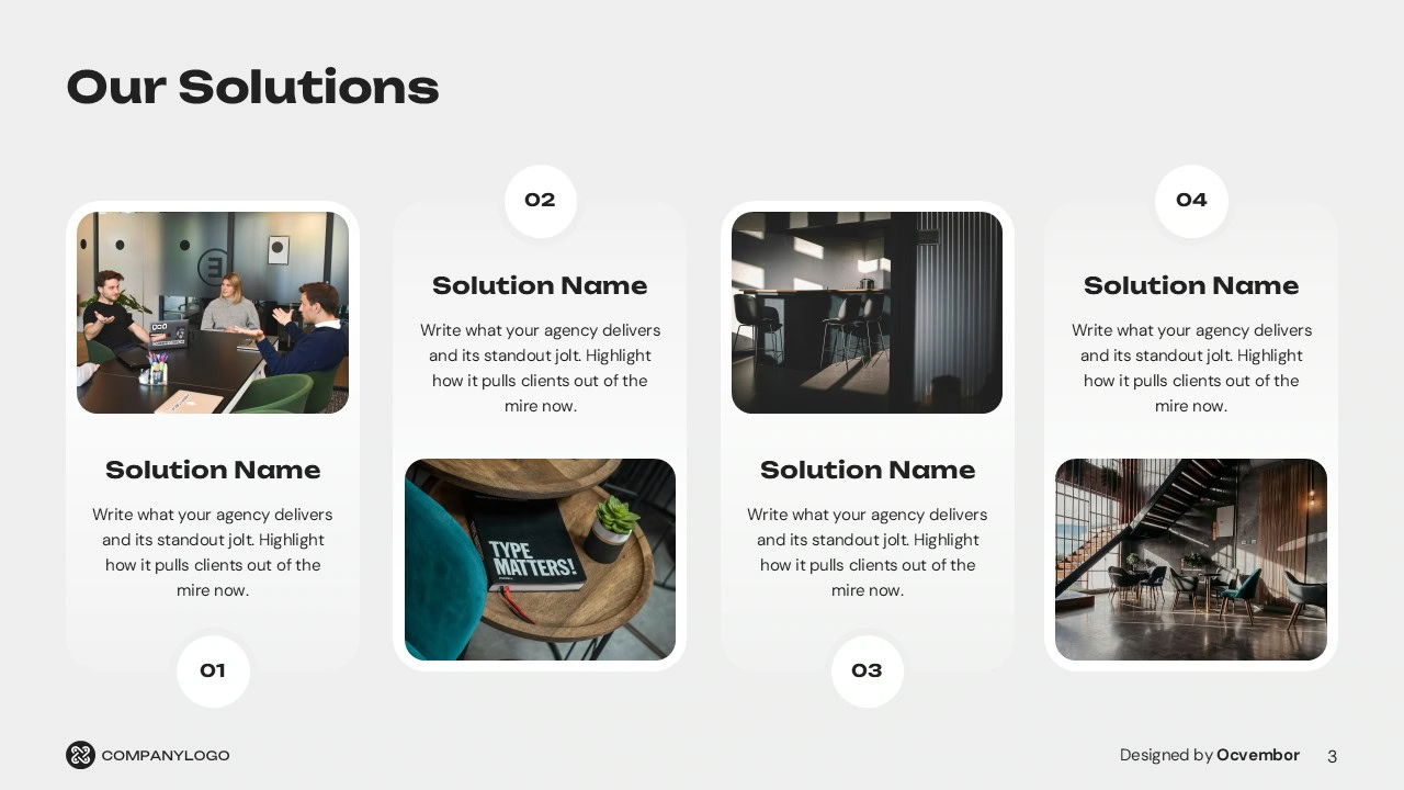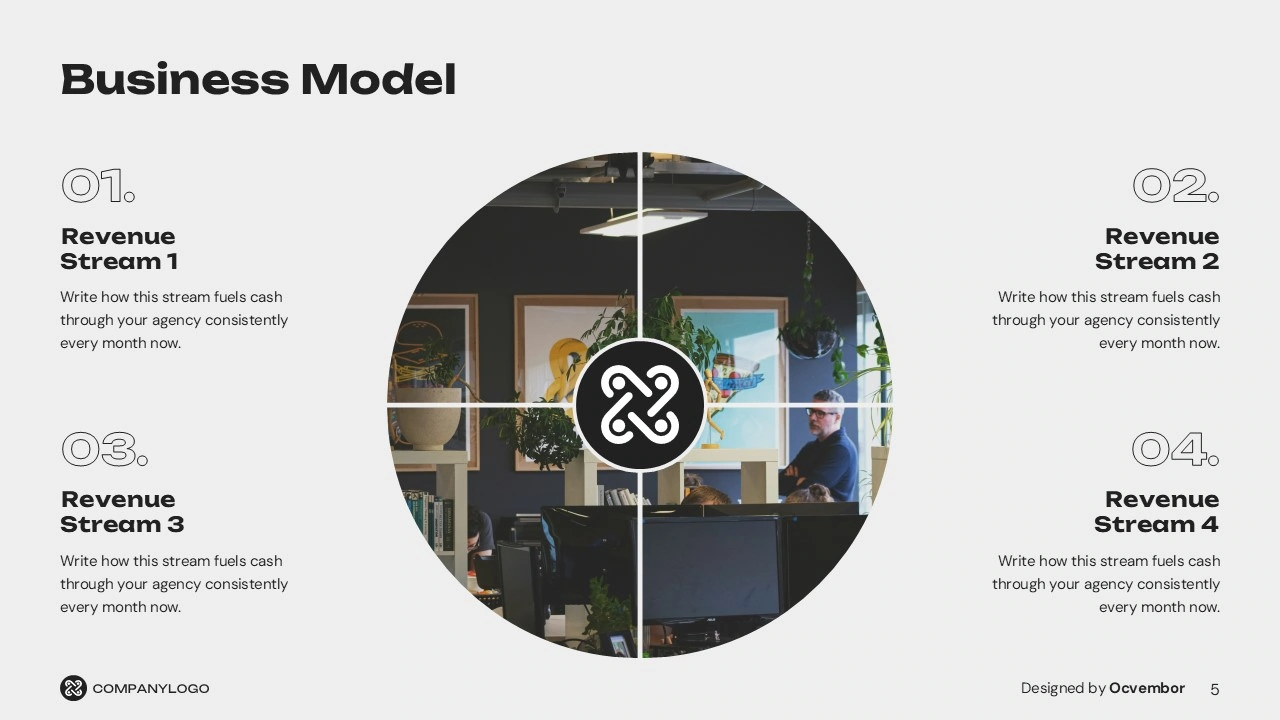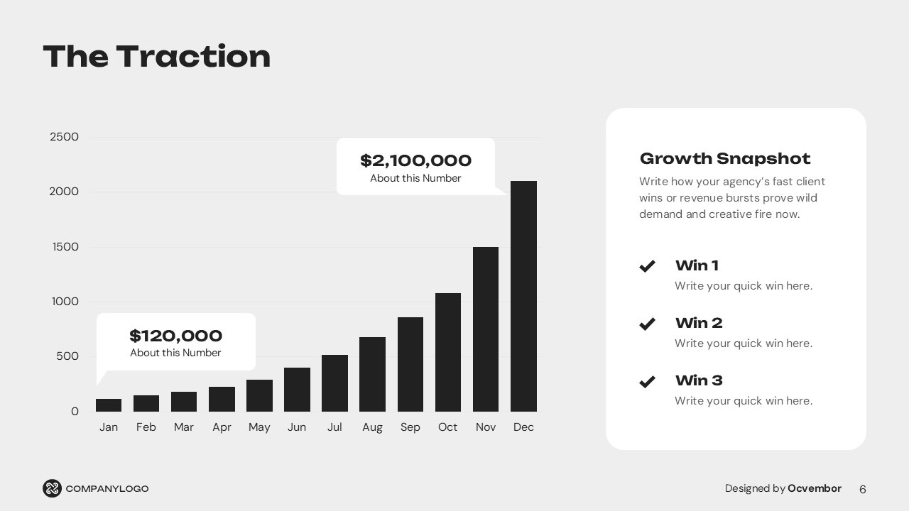 The template features a sleek design with bright and dark backgrounds, blending modern accents with a professional edge. Clean layouts and striking visuals create a cohesive flow, enhanced by placeholders for your logo, project images, and growth charts. It delivers a polished look tailored for agency pitches without design obstacles.