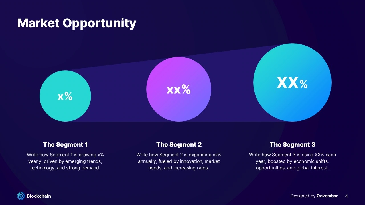 The design pulses with deep dark tones and neon-infused gradients, crafting a futuristic atmosphere that screams innovation. Dynamic layouts and 3D visuals guide the eye, while spaces for your logo, blockchain art, and data charts keep it sharp and professional. No design headaches—just a canvas ready to showcase your crypto dreams.