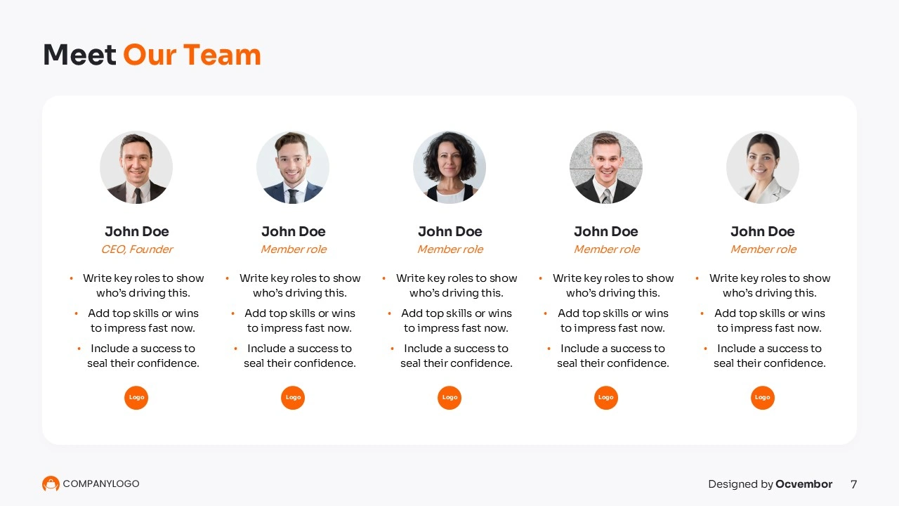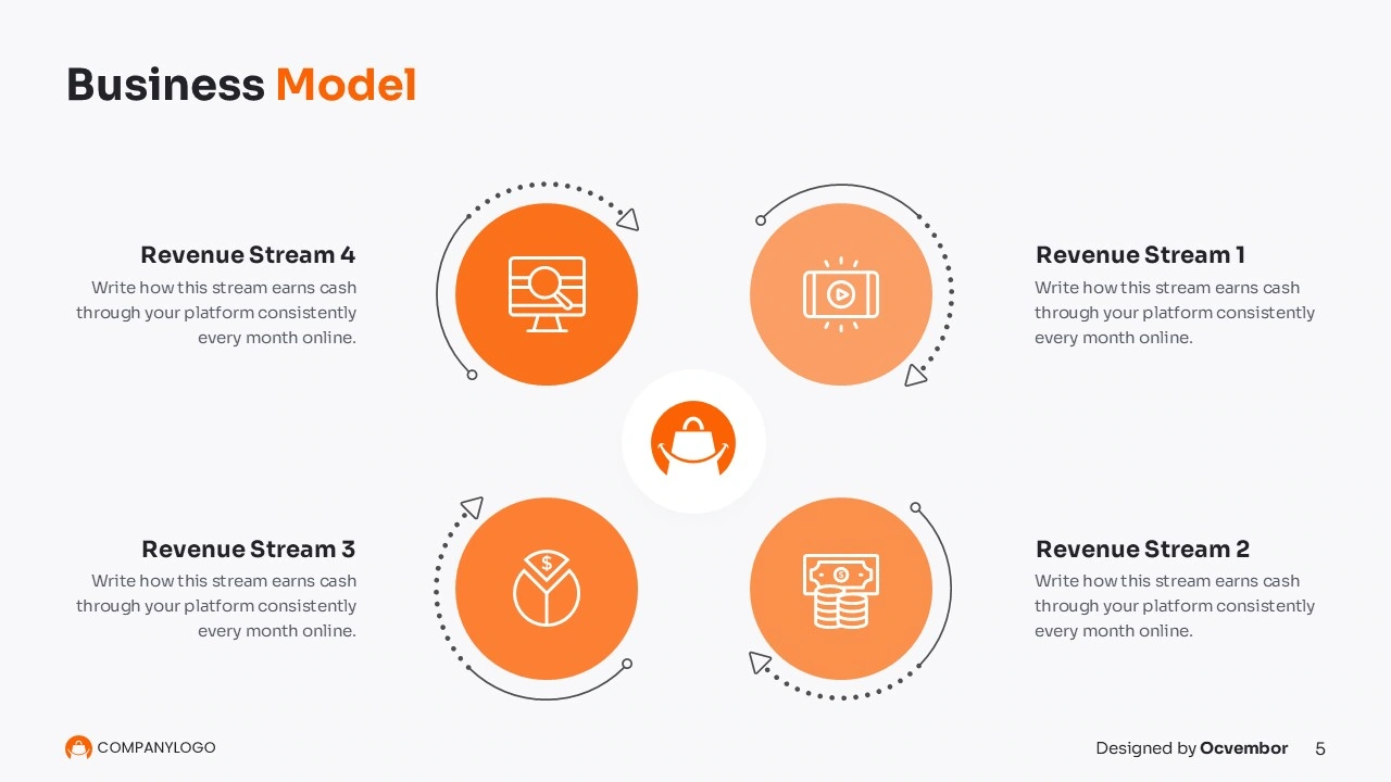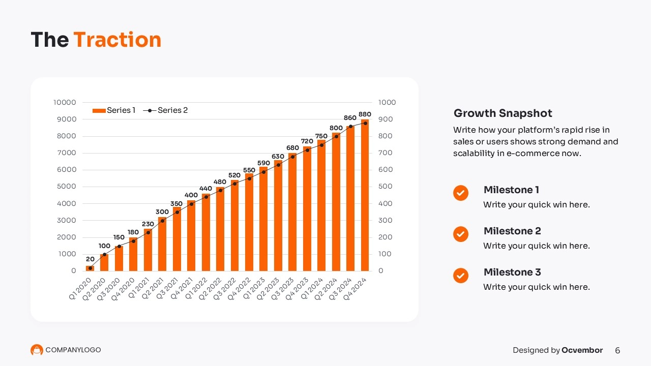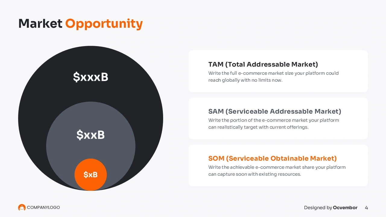 The design pops with vibrant orange tones and engaging layouts, weaving product shots and growth charts into a visual momentum that draws eyes. Clean, shopper-friendly visuals guide through market stats, revenue streams, and team strengths, with space for your logo to anchor the vibe. It’s a polished toolkit for e-commerce pitches, skipping the design hassle.