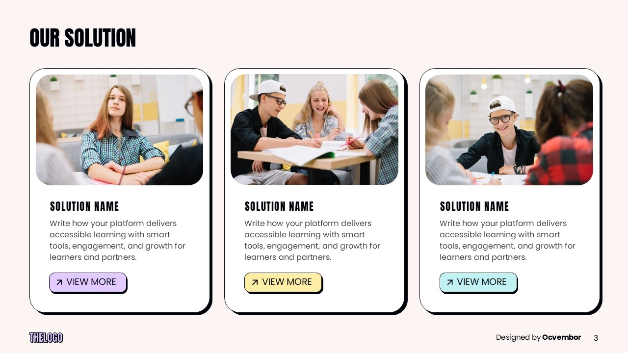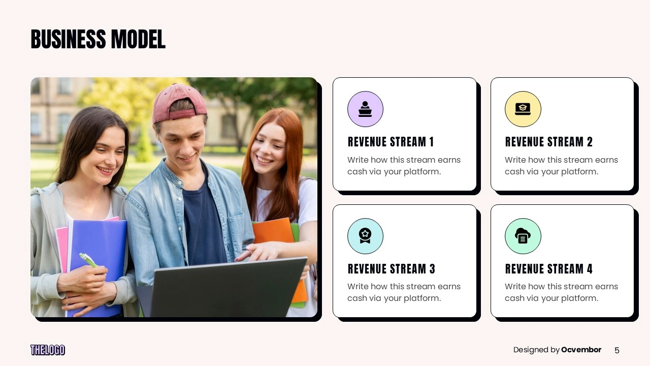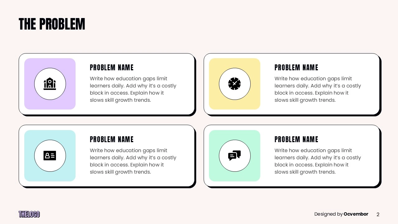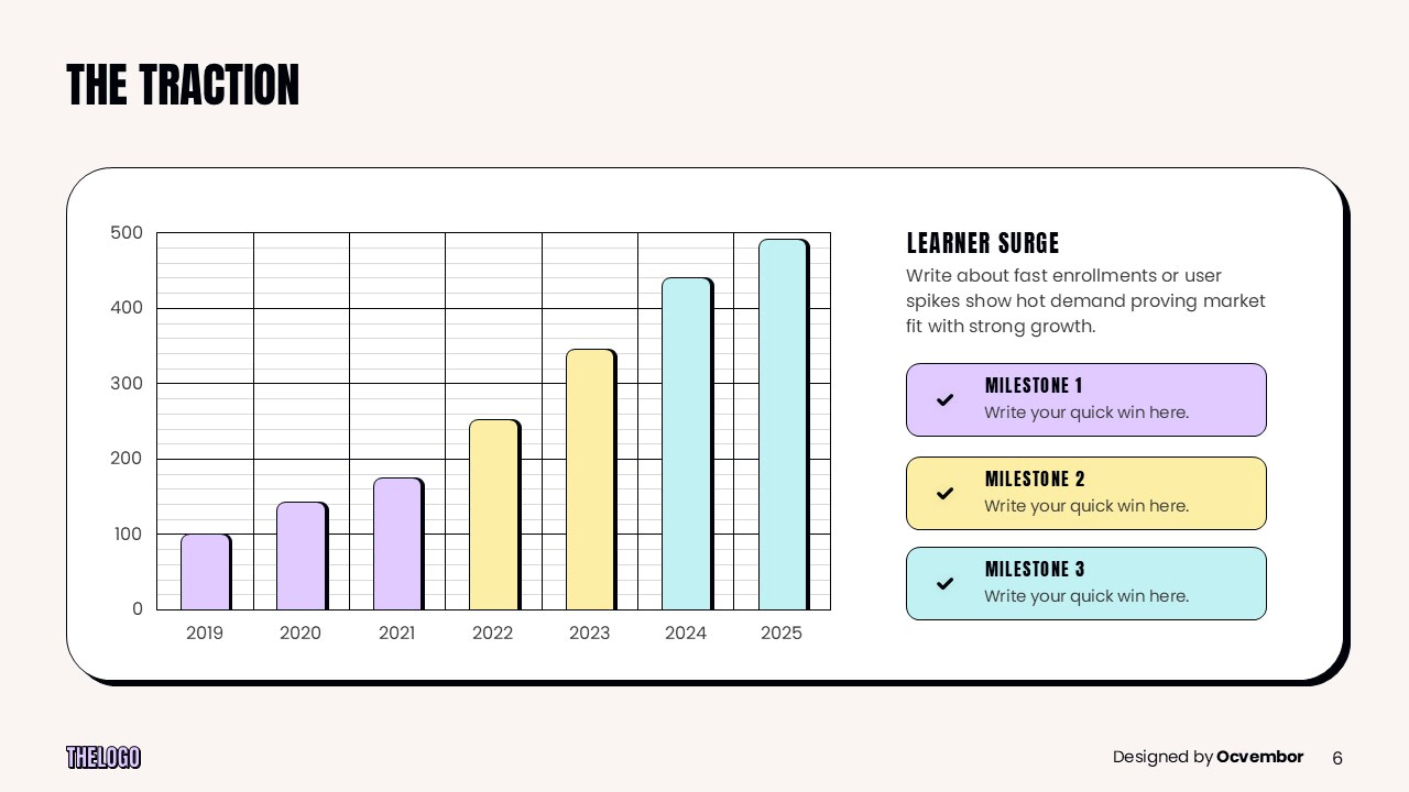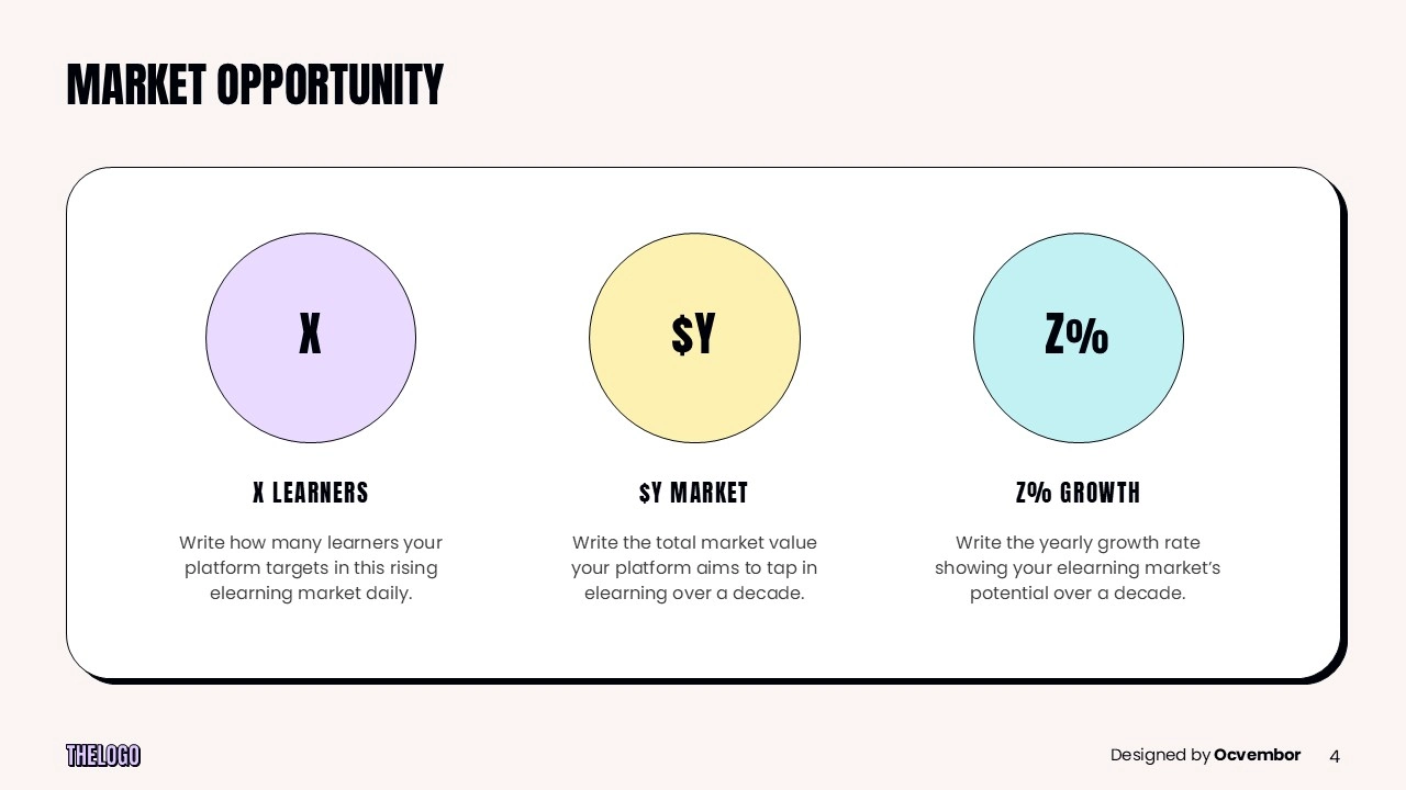 This modern, visually balanced template walks you through every key component of a successful EdTech pitch: the problem facing today’s learners, your solution and platform features, total addressable market, revenue streams, and user traction. With soft colors, clean visuals, and content prompts for each slide, it’s ideal for founders building LMS tools, language learning apps, coding bootcamps, or digital tutoring services.