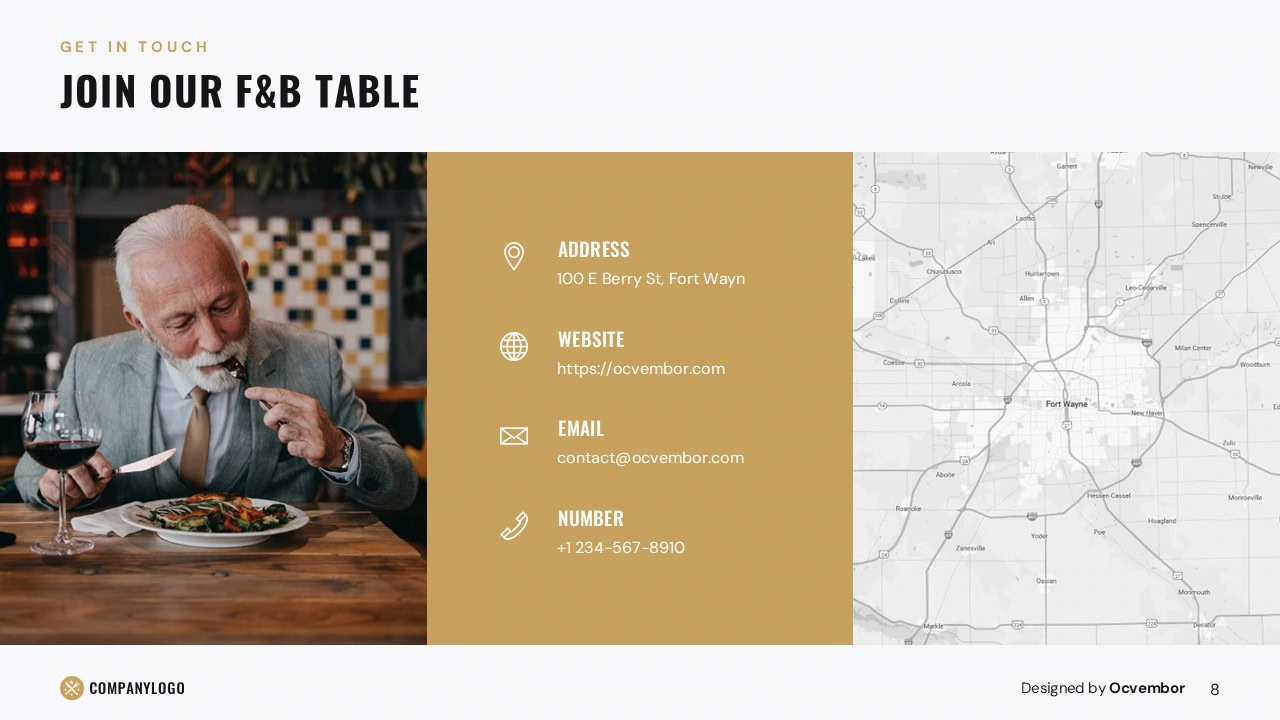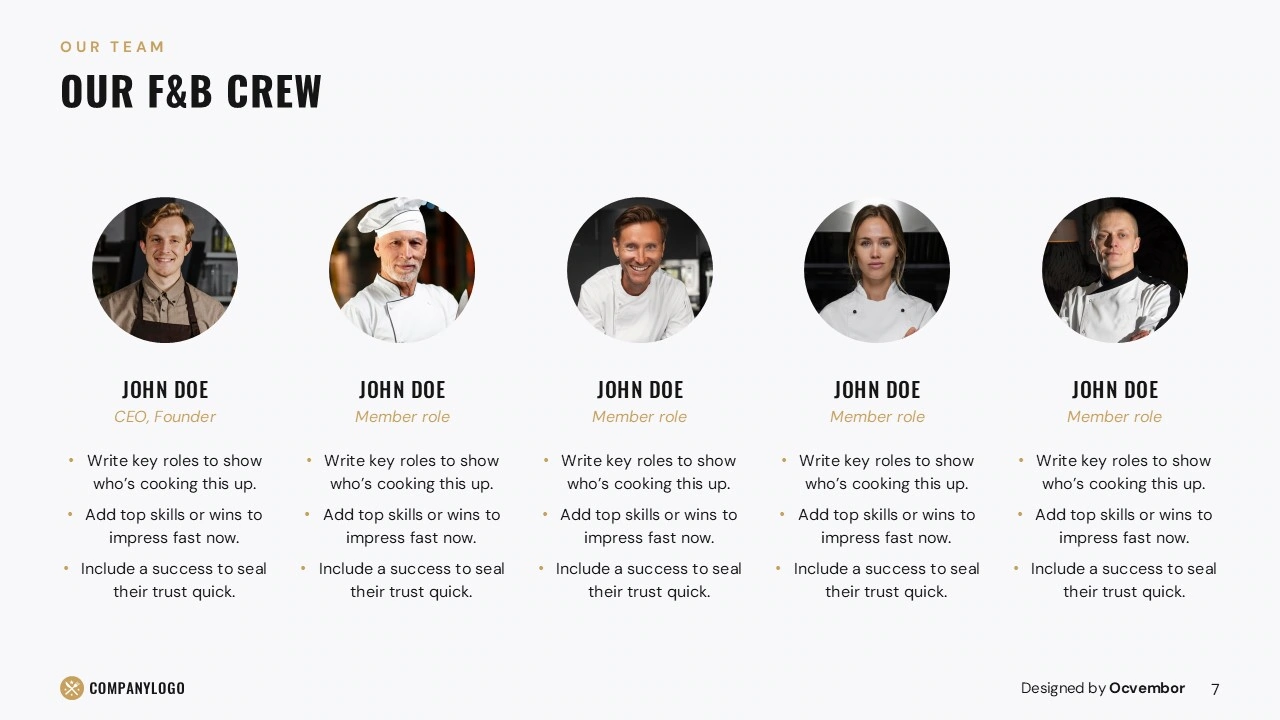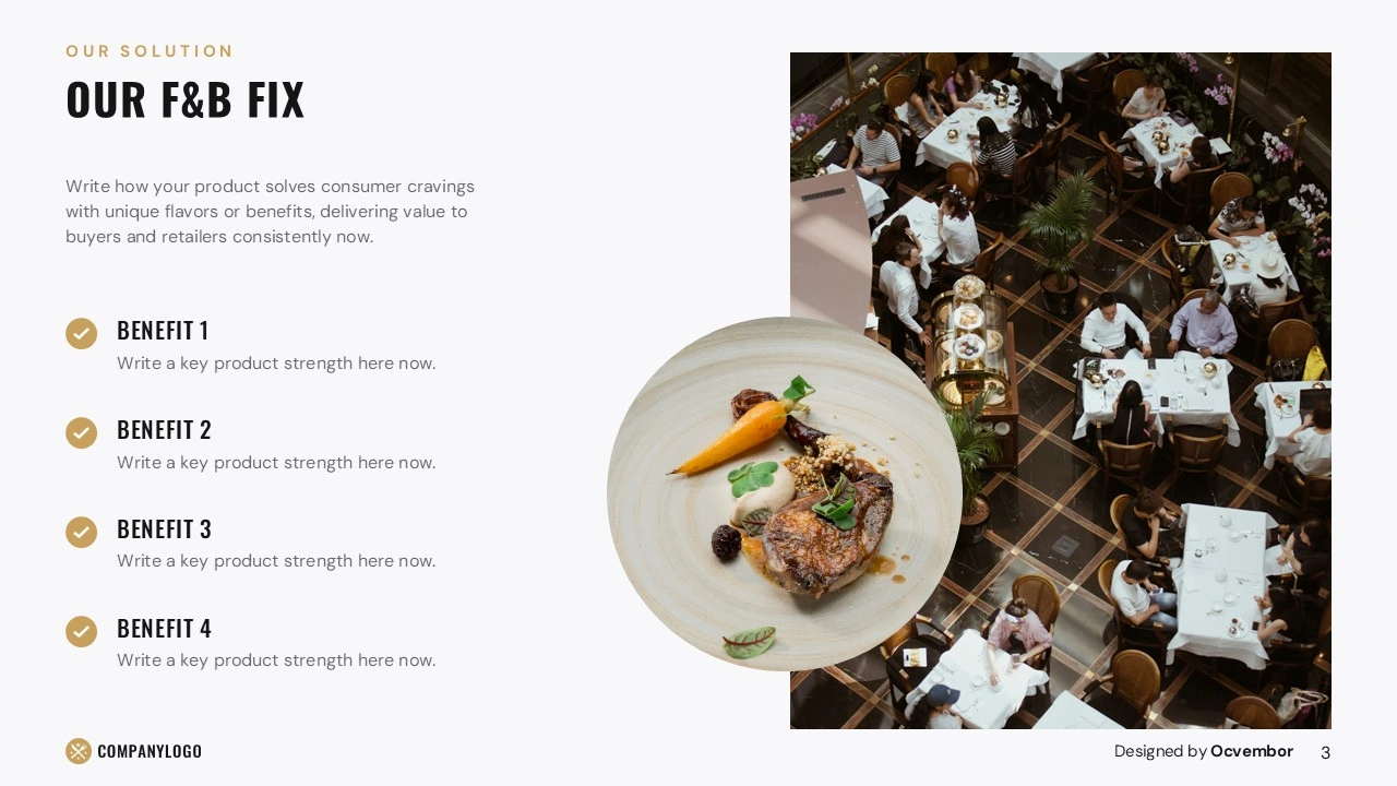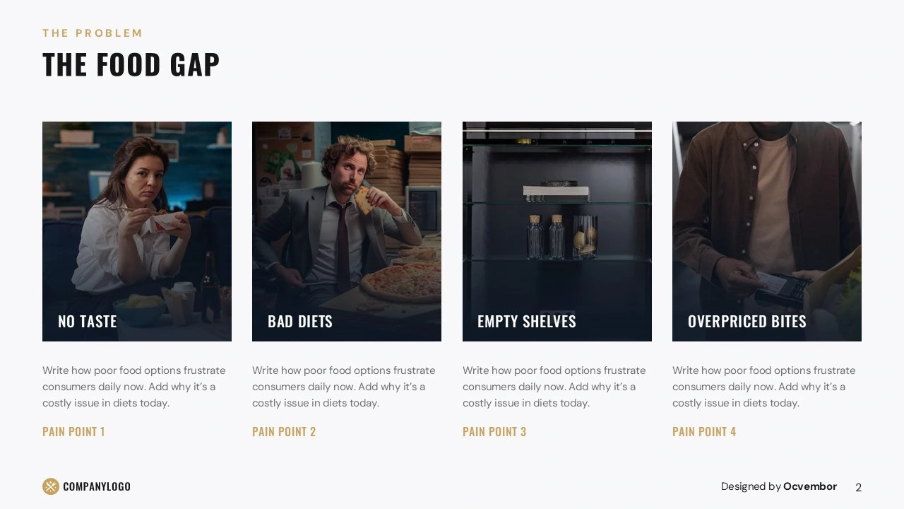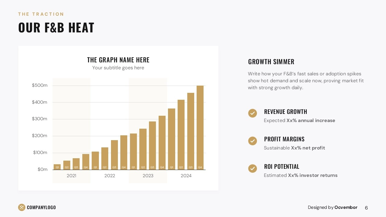 The design radiates with a warm bronze glow and savory visuals, blending dish photos and growth charts into an inviting rhythm. Thoughtful layouts flow from market gaps to team strengths, with space for your logo to anchor the taste. It’s a polished package built for F&B pitches, skipping the design prep work.