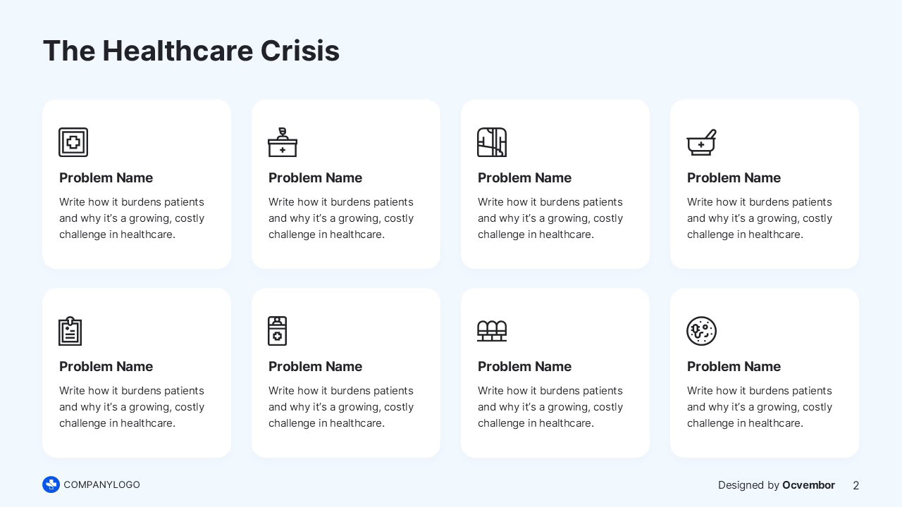 Launch your healthcare innovation with our Free Healthcare Pitch Deck Presentation Template. Designed for medical startups and healthtech pioneers, this 8-slide deck transforms your solution into a powerful narrative. From addressing critical patient challenges to showcasing market potential, it’s built to engage investors and stakeholders. Download now to craft a professional pitch effortlessly, no design skills required.