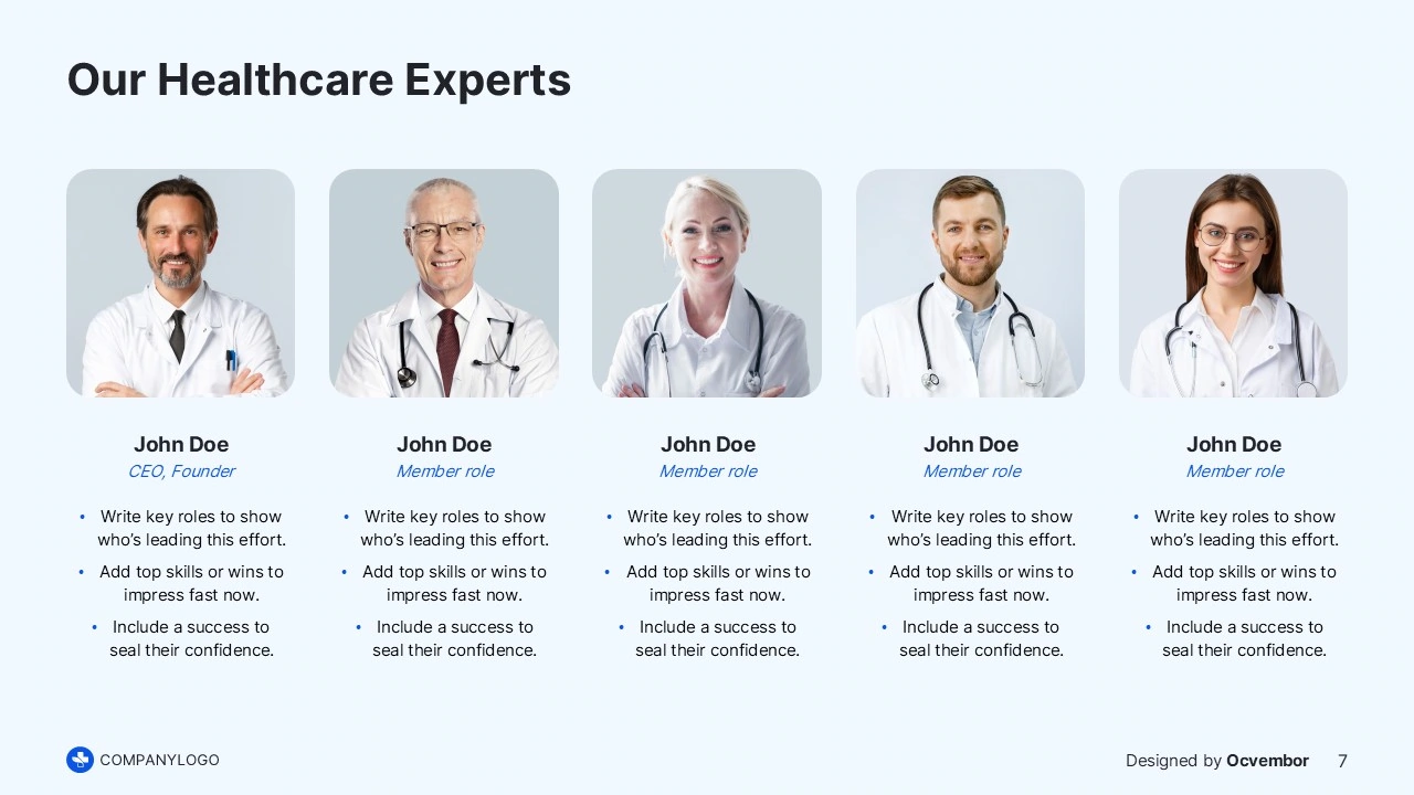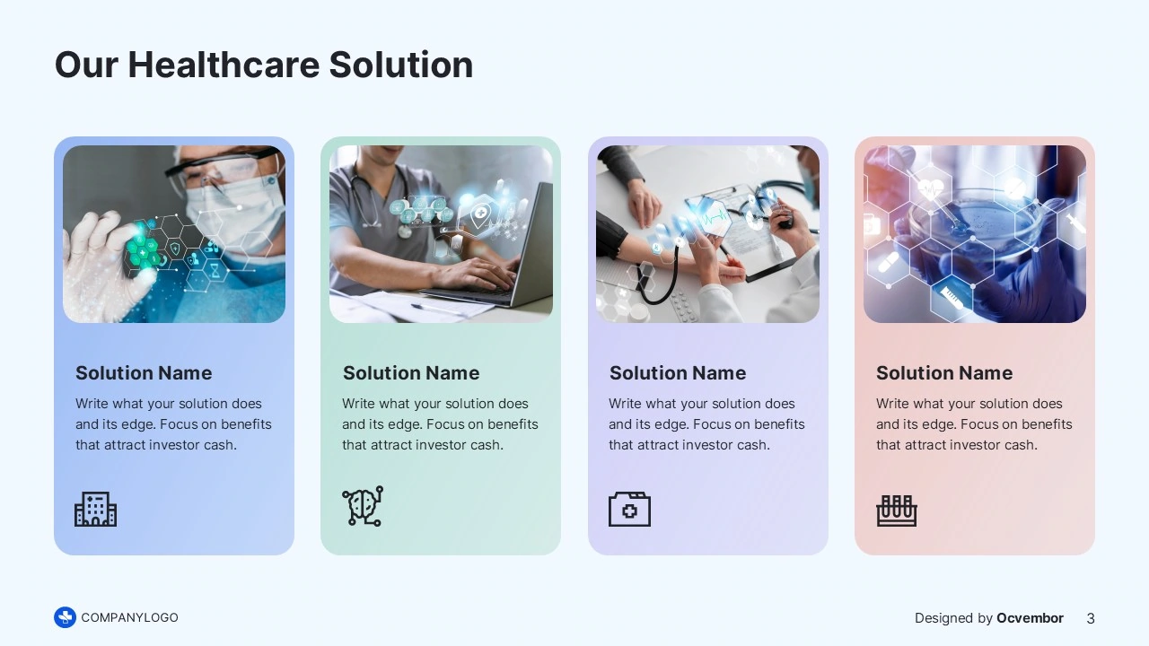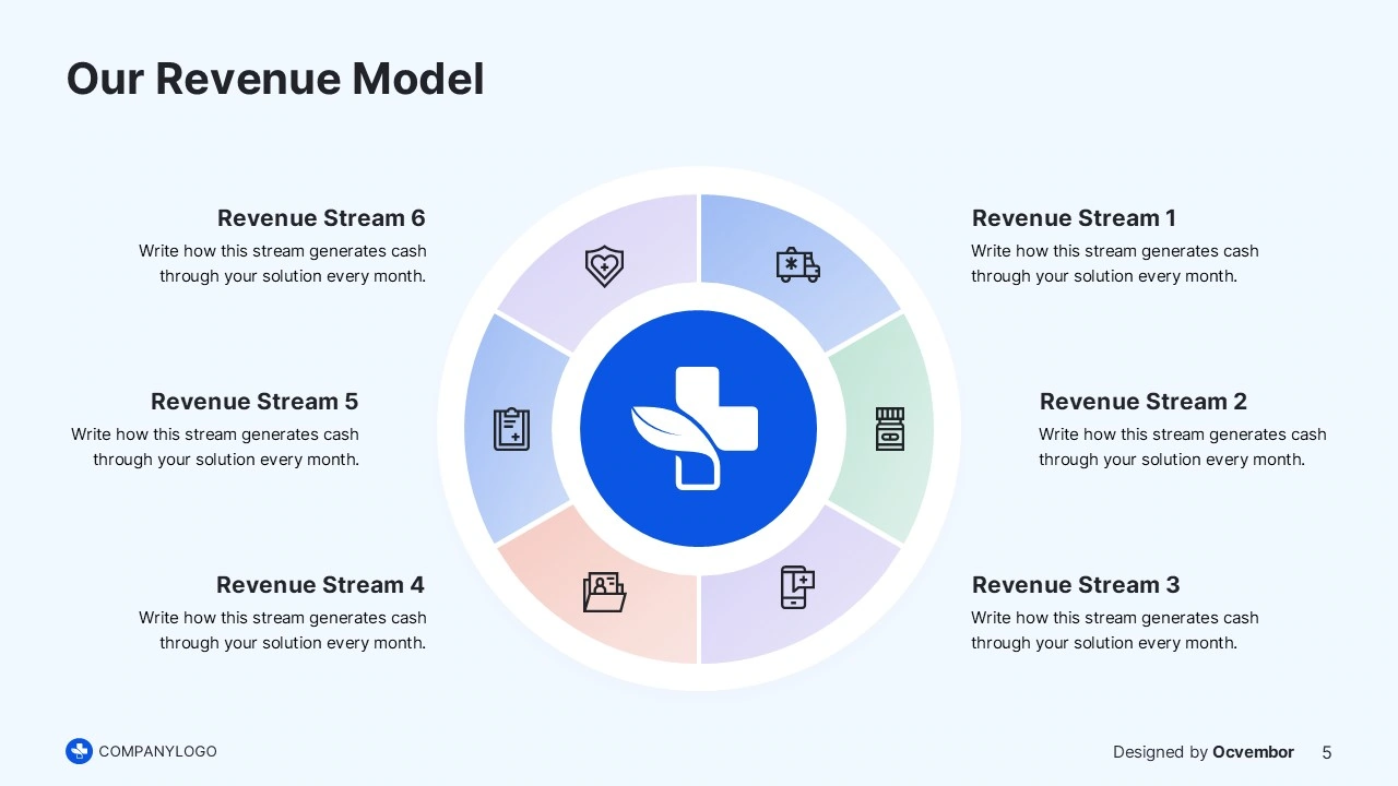 The design glows with soft pastel tones and healing visuals, weaving doctor imagery and growth charts into a balanced layout. Clean, compassionate designs guide through market potential, revenue streams, and expert profiles, with space for your logo to anchor the look. It’s a polished package built for healthcare pitches, skipping the design stress.