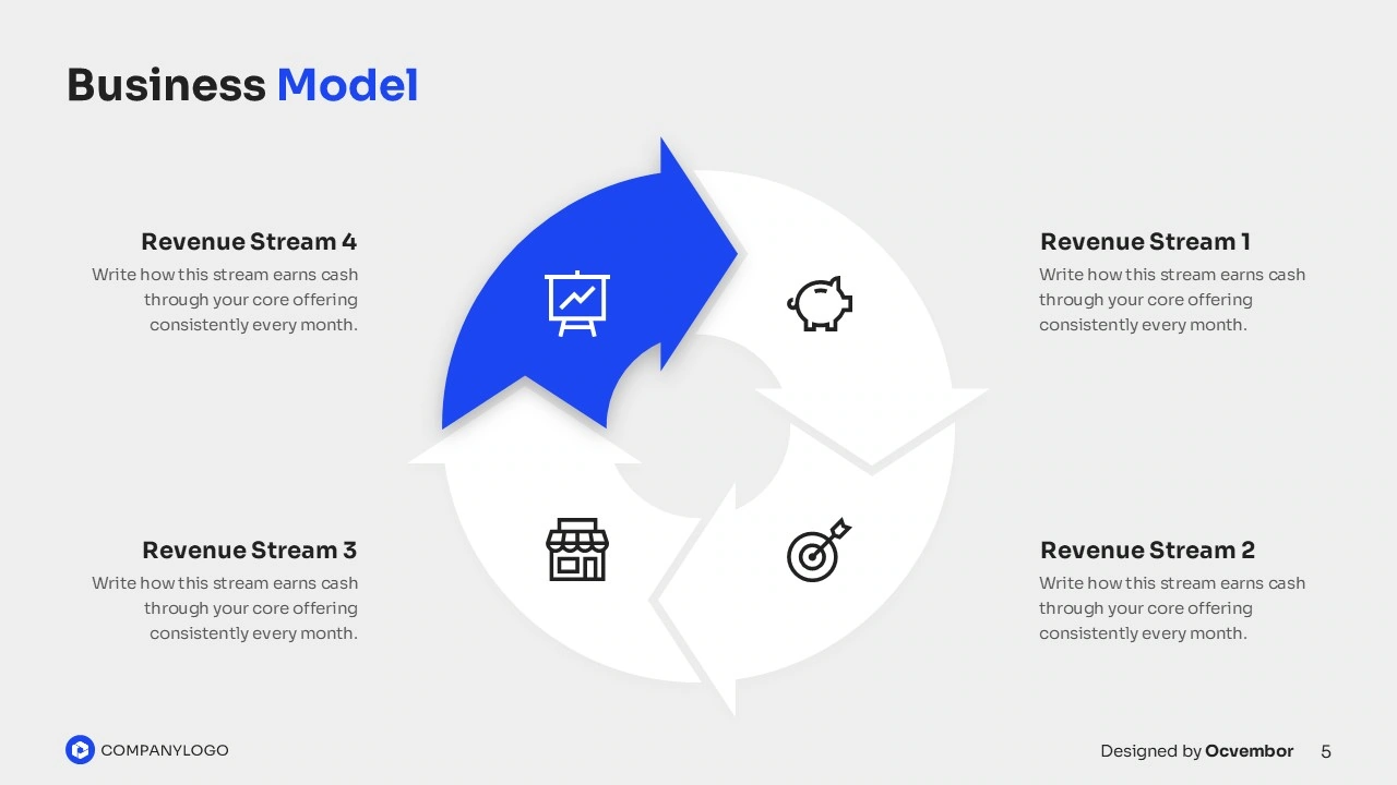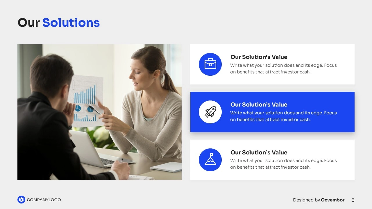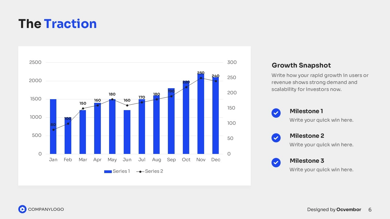 The design stands out with bold blue strokes and confident imagery, blending investor meetings and growth visuals into an open-flow design that invites attention. Smart layouts flow from market stats to team strengths, with room for your logo to ground the narrative. It’s a sleek, investor-ready package that skips the design headache.
