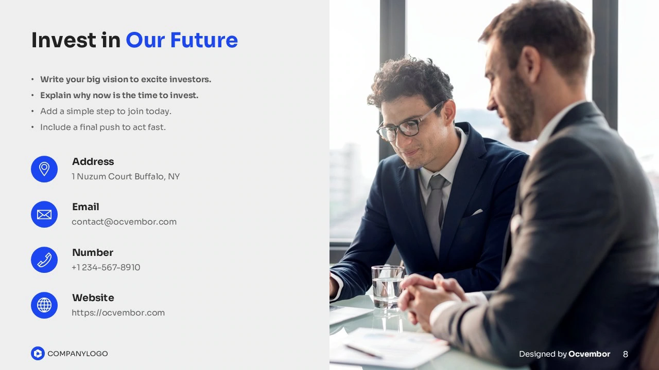 In the high-stakes world of pitching, a bland deck can leave your idea in the dust. Our Free Investor Pitch Deck Presentation Template is your secret weapon, delivering an 8-slide journey that turns your business vision into an irresistible opportunity. Whether it’s a startup, a scale-up, or a bold new venture, this deck lights the way to funding.