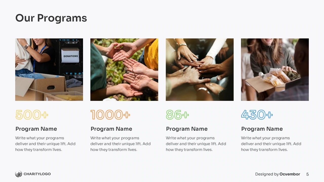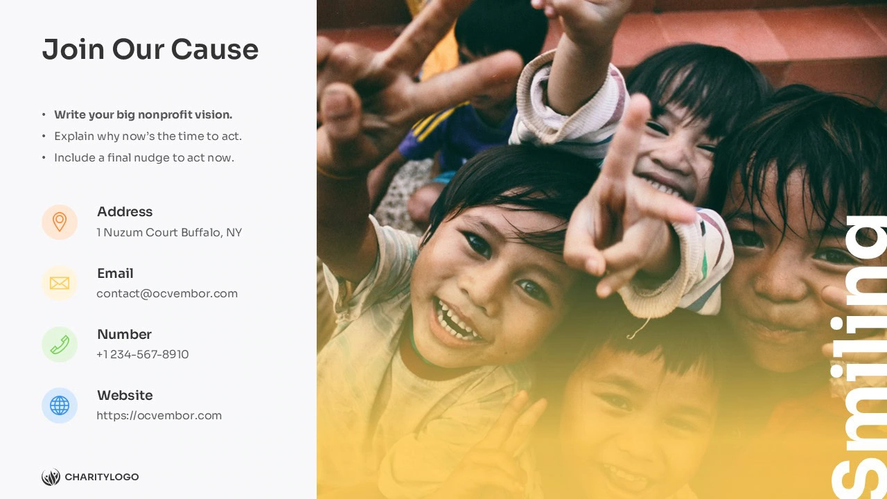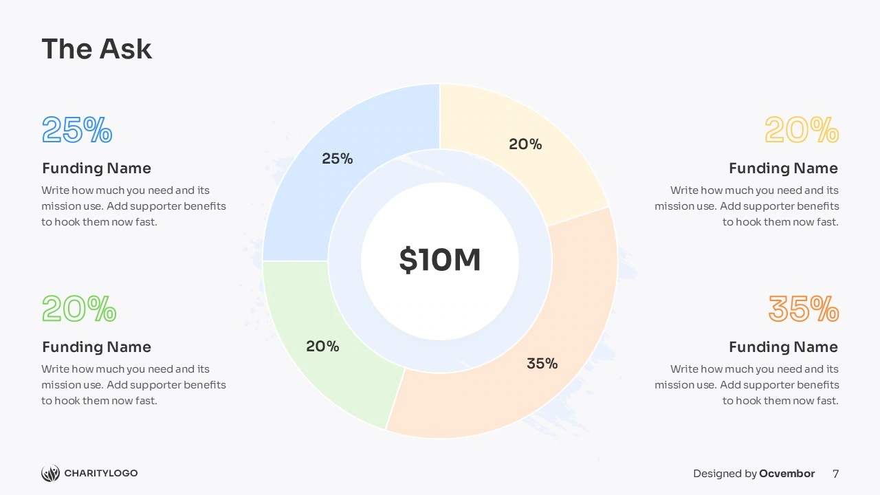 From the striking cover to the final cause, this deck shares your journey: it highlights urgent needs like poverty or education gaps, offers lifts like outreach programs or sustainable aid that transform lives, and maps funding potential with vivid stats. Programs showcase impact, your team’s passion adds trust, and a clear ask invites support. A heartfelt call to join your cause closes with purpose—positioning your mission as the next wave of change.