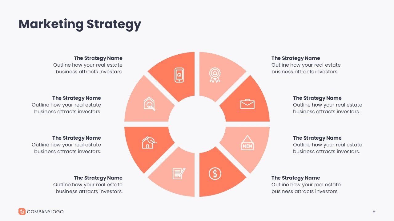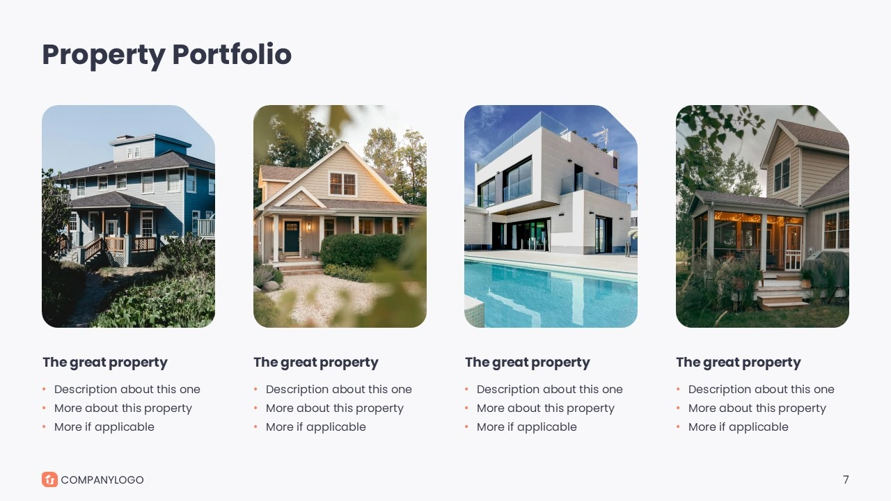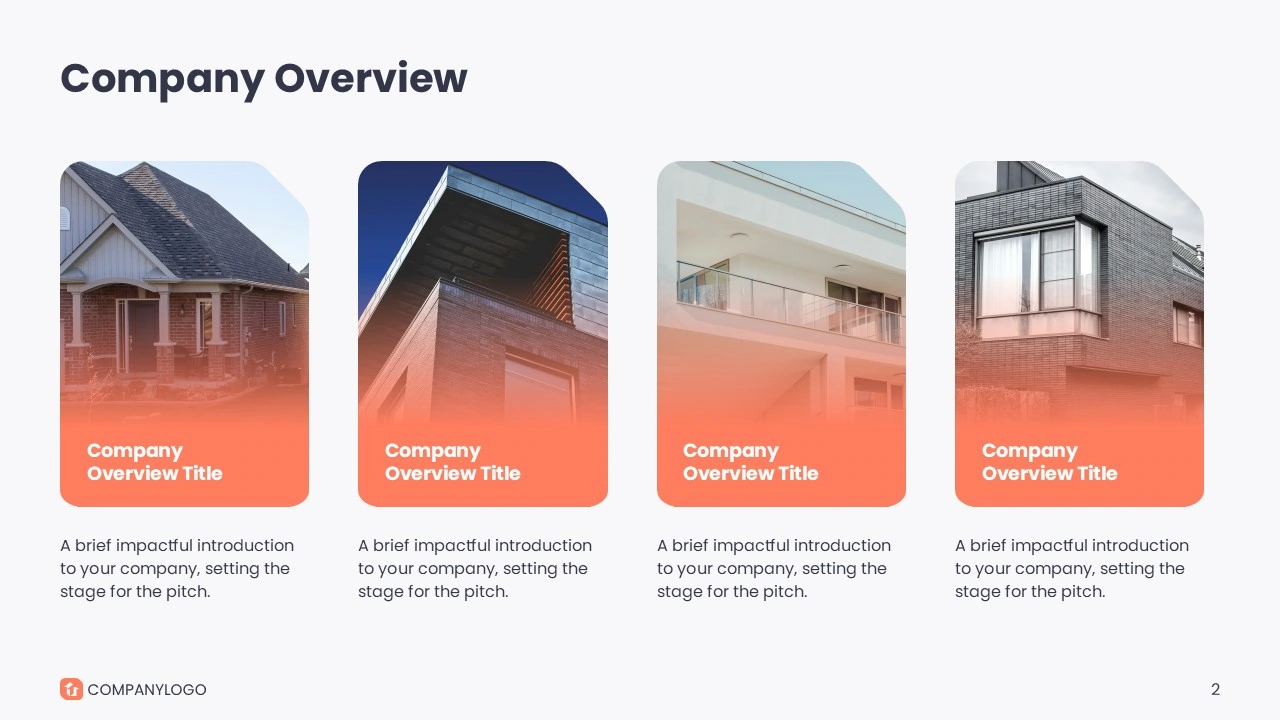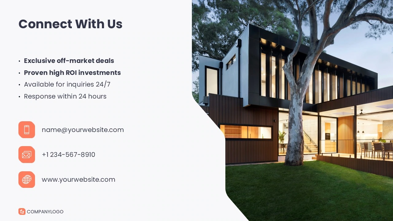 From the opening cover to the closing connect, this deck unfolds your story: a company overview sets the tone, problem statements highlight market gaps, and solutions offer tailored fixes. Market overviews reveal trends, business models outline revenue, and property portfolios showcase gems. Competitive advantages stand firm, marketing strategies attract buyers, and financial projections build trust. The team’s expertise shines, while a final call to connect invites action—positioning your venture as the next real estate milestone.